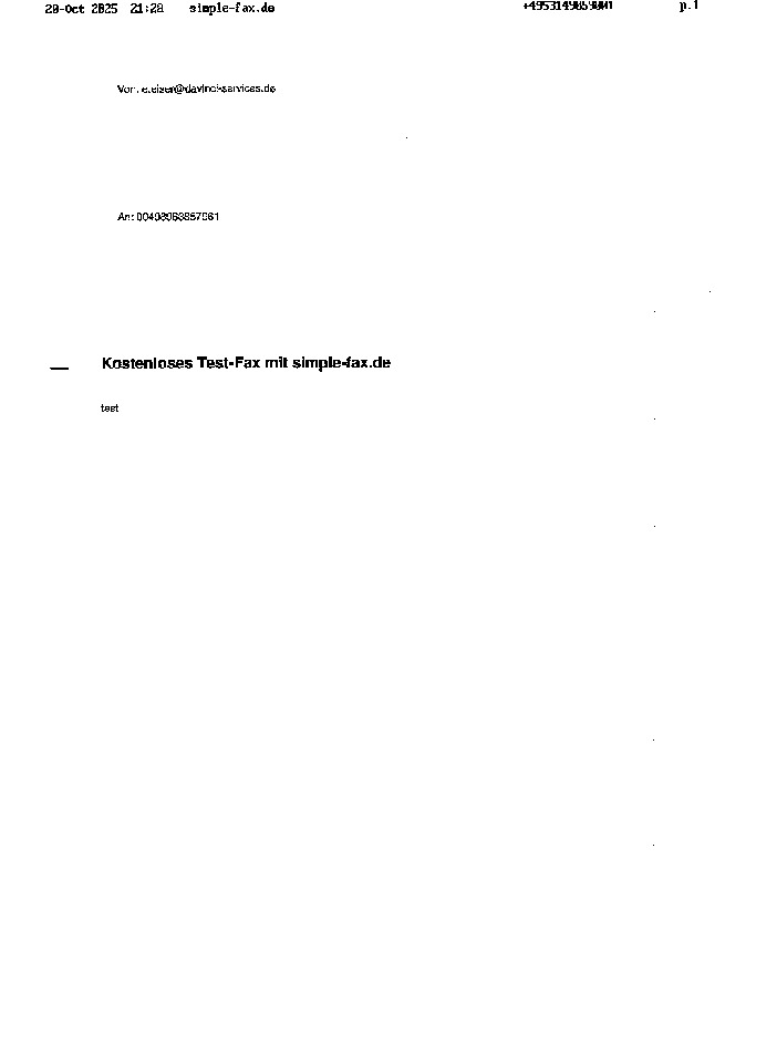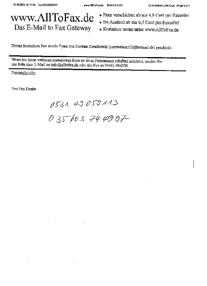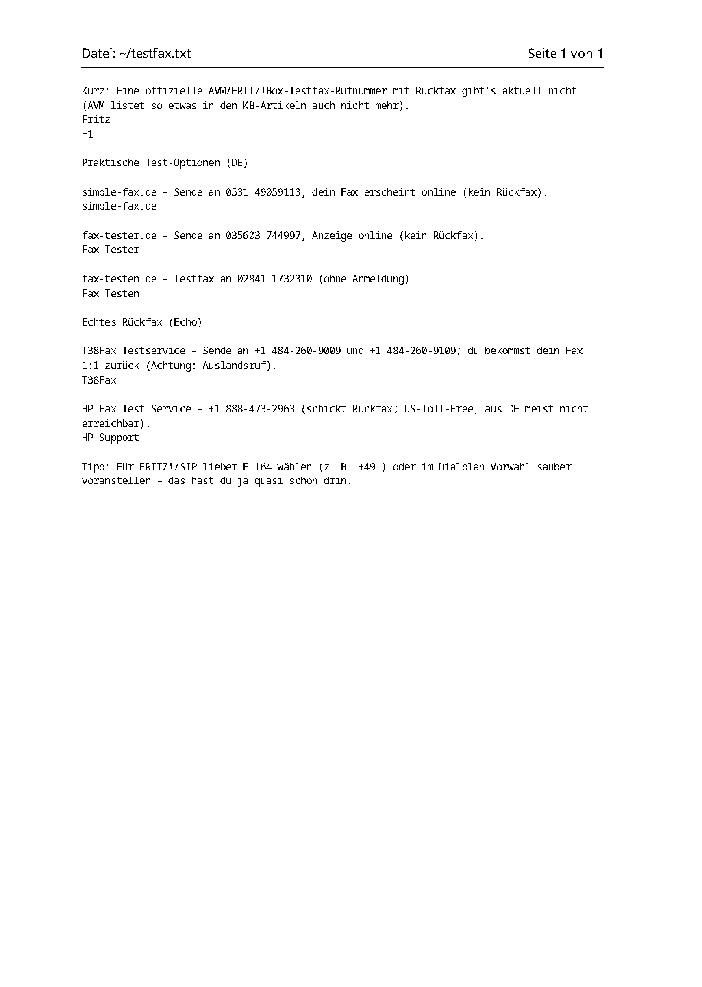 Für die Nutzung dieses Dienstes entstehen keine anderen Kosten als bei ortsüblichen Nutzung Ihres Faxgerätes. Ihr Fax kann dabei auch mehrere Seiten enthalten.