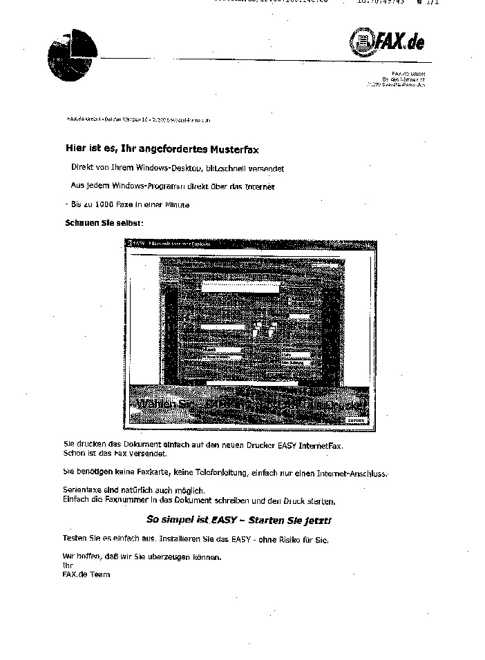 Für die Nutzung dieses Dienstes entstehen keine anderen Kosten als bei ortsüblichen Nutzung Ihres Faxgerätes. Ihr Fax kann dabei auch mehrere Seiten enthalten.